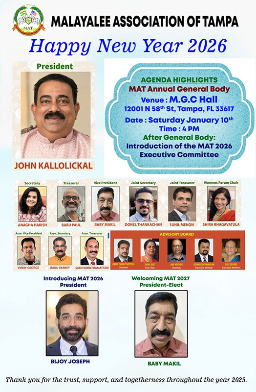 Welcome to the website of MALAYALEE ASSOCIATION OF TAMPA (MAT). MAT is one of the prominent Indian Associations operating in Tampa Bay area, Florida, USA. MAT is a non profit organization with a 501(c)3 status and non-political cultural and educational organization to maintain and promote the rich cultural and educational heritage of the Land of Kerala…………